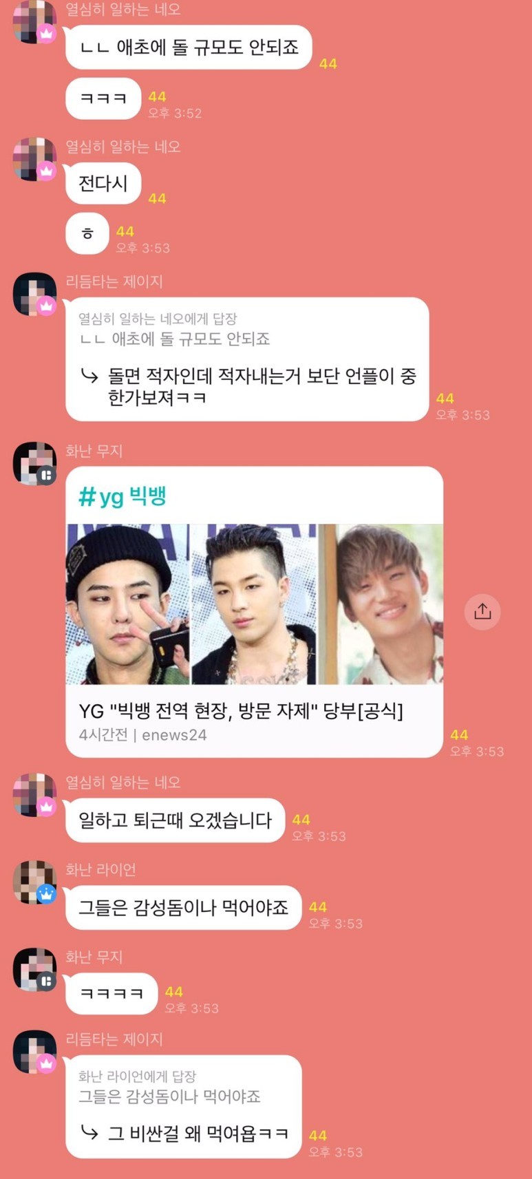 1. 알아서 떵러져나가니;; ㅋㅋㅋ 한팀은 주작 한팀은 방탄한테 깝쳐