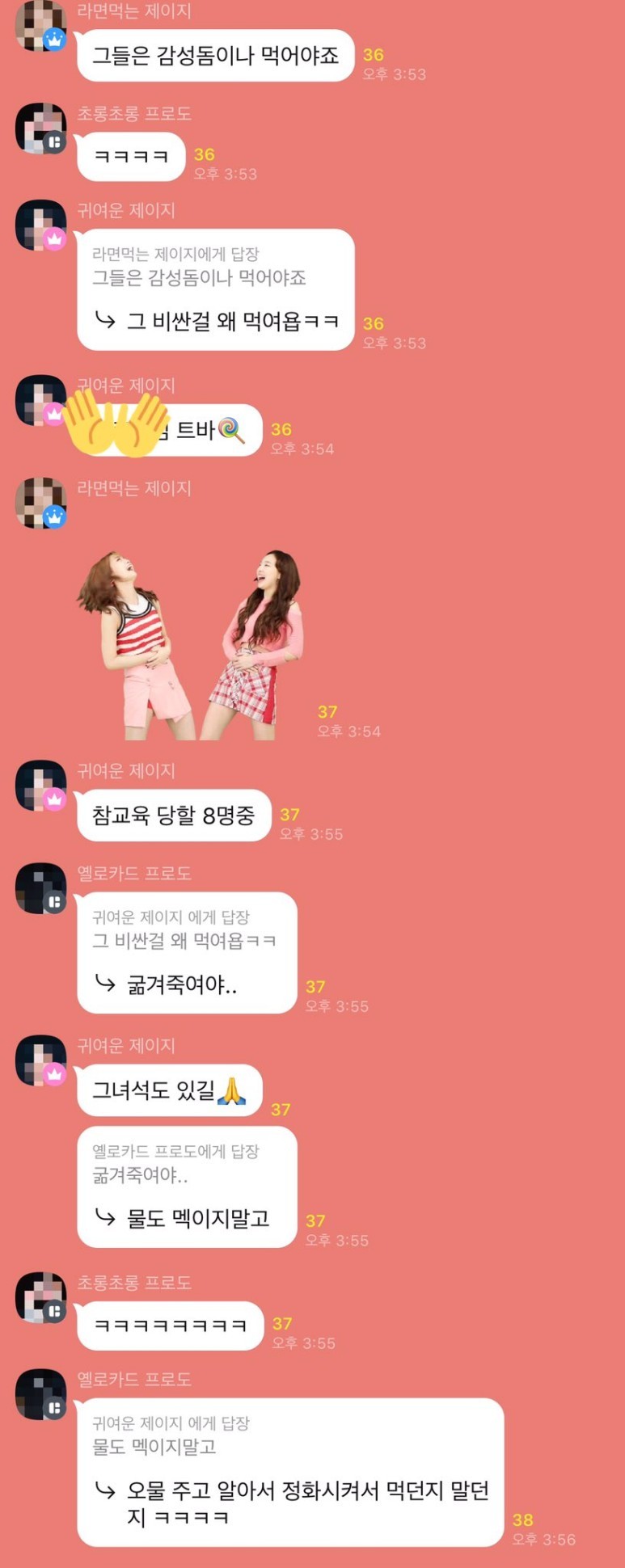 단톡방에서 쉴새없이 다른 아이돌을 비방하는 글이 올라오고 선동을 하고 다른 커뮤니티로 퍼나르는 과정을 봐왔을 트와이스 팬덤은 단 한명도 문제제기를 하지 않았으며...